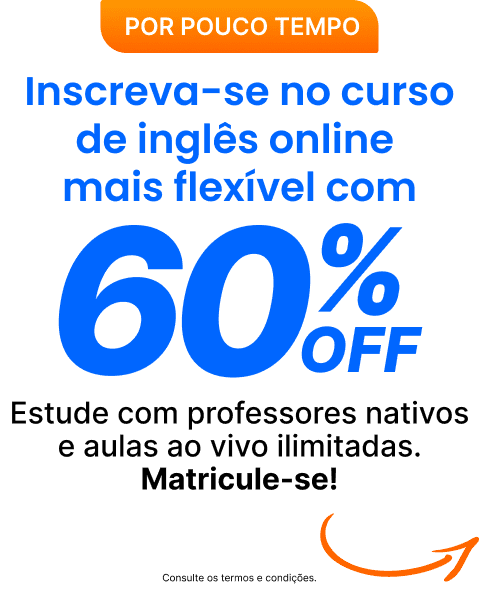 A promoção serĂĄ vĂĄlida entre 00h de 23 de Março de 2026 e 23h59 de 03 de Abril de 2026 (doravante denominado âPrazoâ). Uma vez encerrado o Prazo, a Promoção serĂĄ desativada e a oferta de serviços oferecido pela Open English jĂĄ nĂŁo implicarĂĄ nos benefĂcios aqui descritos. A Promoção nĂŁo tem carĂĄter cumulativo, nem poderĂĄ ser utilizada conjuntamente com qualquer outra ação promocional que possa estar em vigor durante o referido Prazo, nem pode ser vendida, transferida ou cedida. A oferta nĂŁo tem valor em dinheiro e nĂŁo Ă© resgatĂĄvel em dinheiro. Se tiver direito a qualquer reembolso, este nĂŁo incluirĂĄ o desconto ou o seu valor de resgate, nĂŁo receberĂĄ mais do que o montante pago em relação ao preço de compra. Esta promoção estĂĄ sujeita aos termos e condiçÔes e Ă PolĂtica de Privacidade da Open English publicada no website Open English.