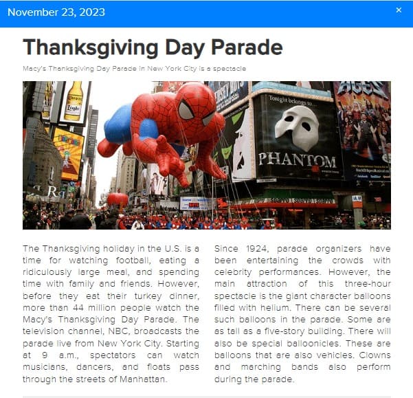 E adivinha só? Na nossa plataforma online, você tem acesso a milhares de textos em inglês para treinar sua leitura todos os dias, com notícias diárias do que rola de mais importante por aí. Como essa notícia sobre o Thanksgiving, por exemplo: